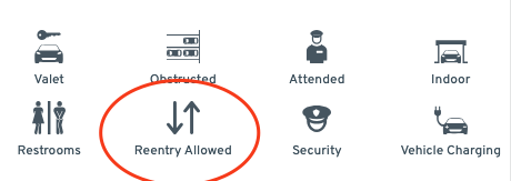 If a specific parking facility does allow you to come and go during your reserved timeframe, you’ll see a “Reentry Allowed” amenity icon listed in the Details section of the listing, both before and after purchase.